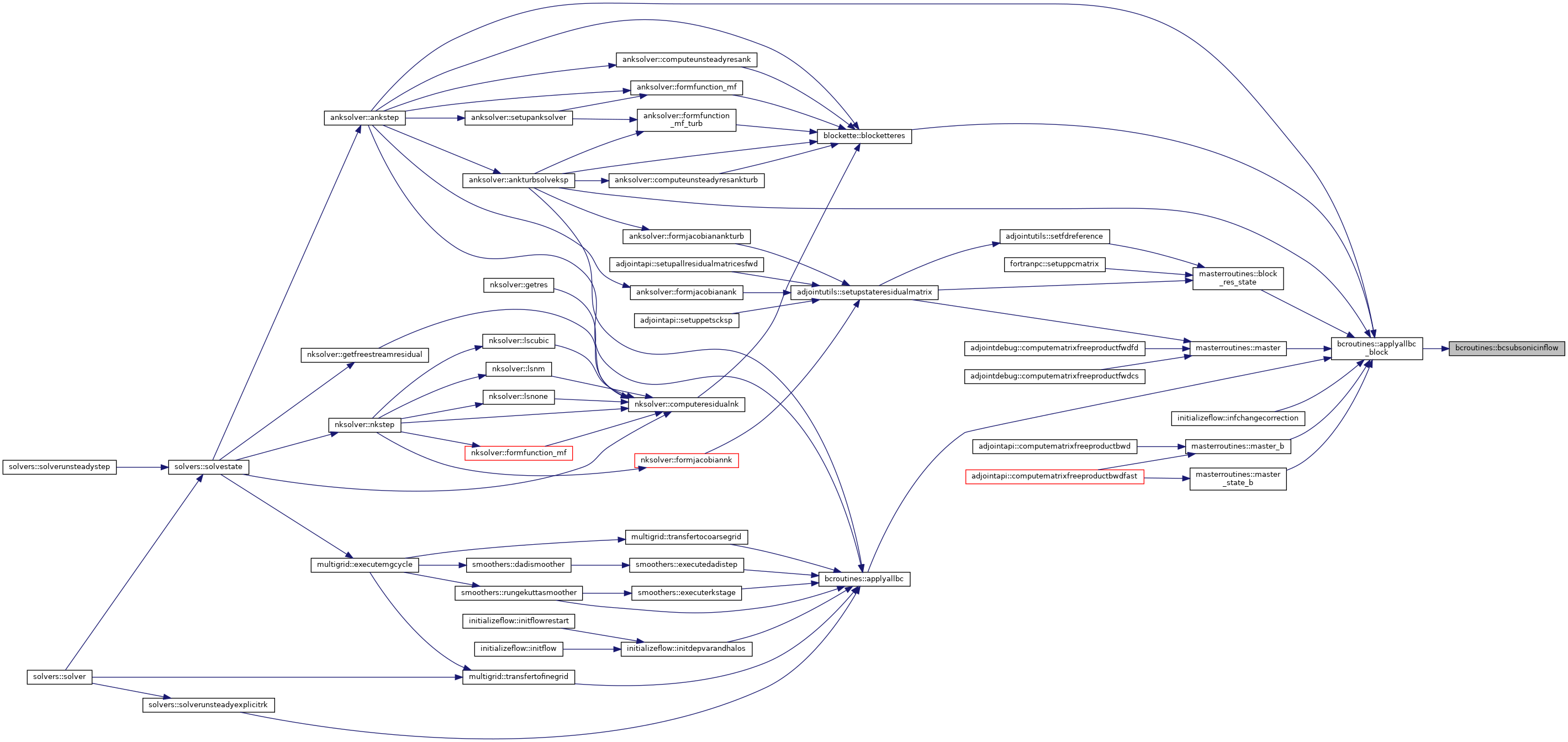 References blockpointers::aa, bceulerwall(), bcextrap(), bcfarfield(), bcnswalladiabatic(), bcnswallisothermal(), bcsubsonicinflow(), bcsubsonicoutflow(), bcsupersonicinflow(), bcsymm1sthalo(), bcsymm2ndhalo(), bcsymmpolar1sthalo(), bcsymmpolar2ndhalo(), blockpointers::bctype, blockpointers::bmti1, blockpointers::bmti2, blockpointers::bmtj1, blockpointers::bmtj2, blockpointers::bmtk1, blockpointers::bmtk2, blockpointers::d2wall, blockpointers::dw, constants::eulerwall, constants::extrap, constants::farfield, blockpointers::fw, blockpointers::gamma, utils::getcorrectfork(), blockpointers::il, blockpointers::jl, blockpointers::kl, constants::massbleedoutflow, blockpointers::nbocos, constants::nswalladiabatic, constants::nswallisothermal, blockpointers::nviscbocos, blockpointers::p, blockpointers::rev, blockpointers::rlv, blockpointers::s, blockpointers::scratch, blockpointers::sectionid, utils::setbcpointers(), blockpointers::sfacei, blockpointers::sfacej, blockpointers::sfacek, blockpointers::si, blockpointers::sj, blockpointers::sk, constants::subsonicinflow, constants::subsonicoutflow, constants::supersonicinflow, constants::supersonicoutflow, constants::symm, constants::symmpolar, blockpointers::vol, blockpointers::volold, blockpointers::w, blockpointers::wold, and blockpointers::x.