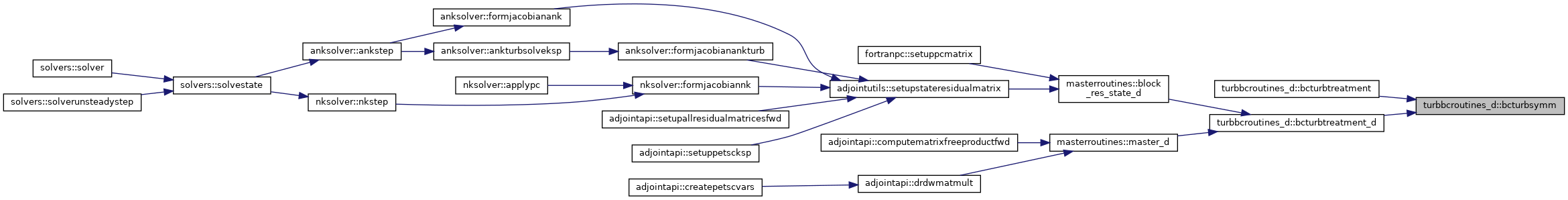 References bcturbfarfield_d(), bcturbinterface_d(), bcturbsymm(), bcturbwall_d(), blockpointers::bctype, blockpointers::bmti1, blockpointers::bmti2, blockpointers::bmtj1, blockpointers::bmtj2, blockpointers::bmtk1, blockpointers::bmtk2, blockpointers::bvti1, blockpointers::bvti1d, blockpointers::bvti2, blockpointers::bvti2d, blockpointers::bvtj1, blockpointers::bvtj1d, blockpointers::bvtj2, blockpointers::bvtj2d, blockpointers::bvtk1, blockpointers::bvtk1d, blockpointers::bvtk2, blockpointers::bvtk2d, constants::domaininterfaceall, constants::domaininterfacep, constants::domaininterfacerho, constants::domaininterfacerhouvw, constants::domaininterfacetotal, constants::eulerwall, constants::farfield, blockpointers::ie, blockpointers::je, blockpointers::ke, blockpointers::nbocos, constants::nswalladiabatic, constants::nswallisothermal, flowvarrefstate::nt1, flowvarrefstate::nt2, constants::oversetouterbound, constants::slidinginterface, constants::symm, constants::symmpolar, and constants::zero.