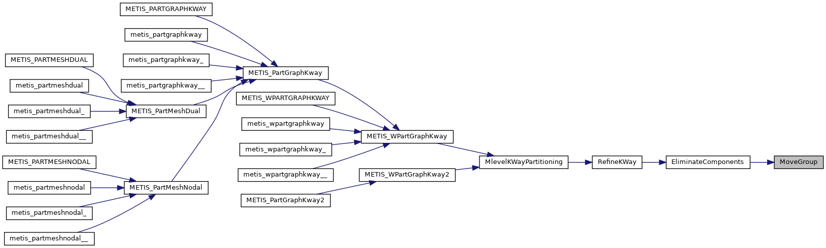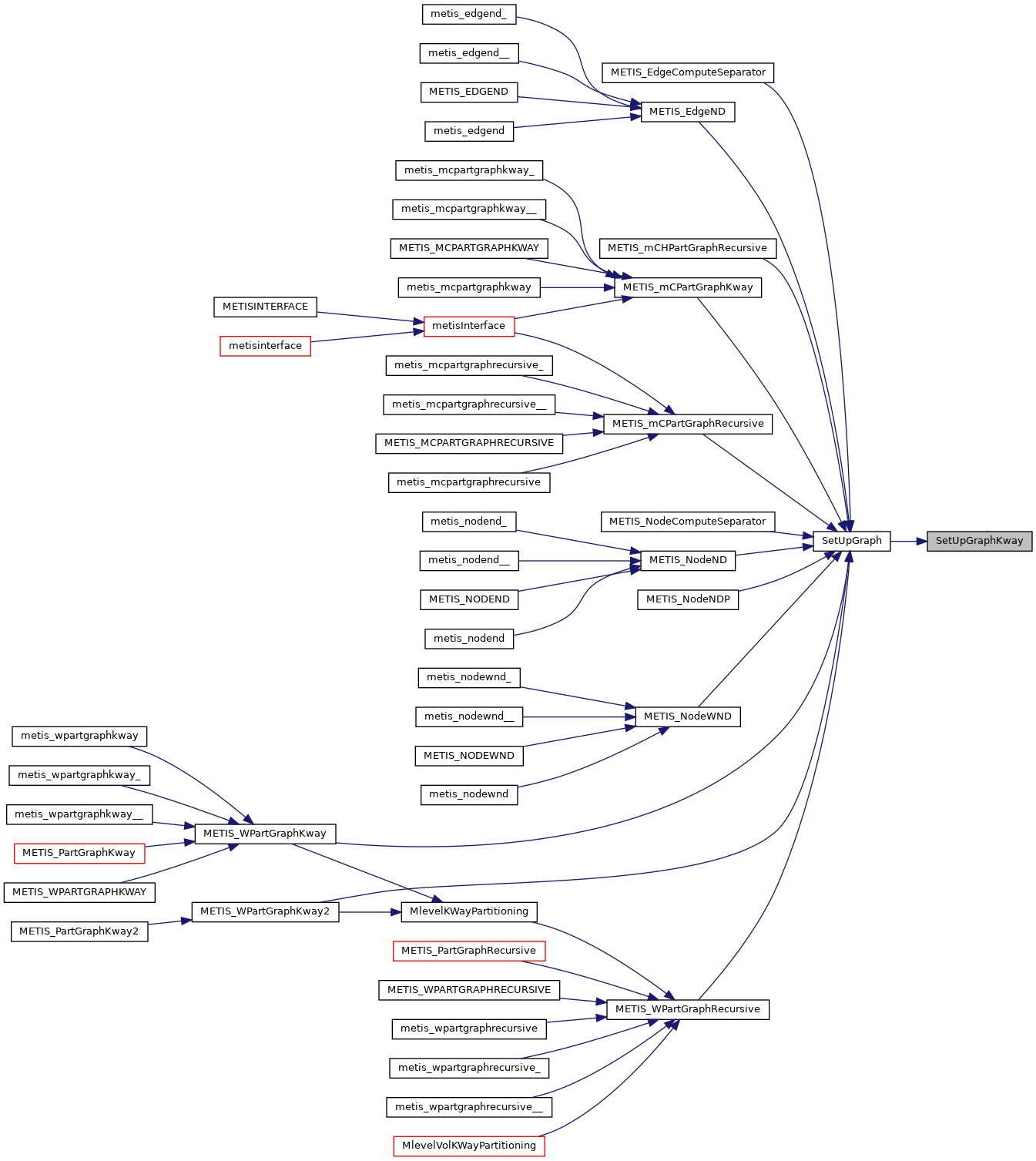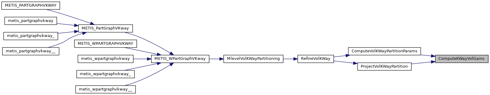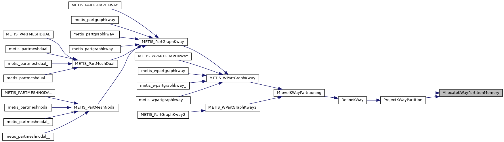 | void | metis_partgraphkway_ (int *nvtxs, idxtype *xadj, idxtype *adjncy, idxtype *vwgt, idxtype *adjwgt, int *wgtflag, int *numflag, int *nparts, int *options, int *edgecut, idxtype *part) |
