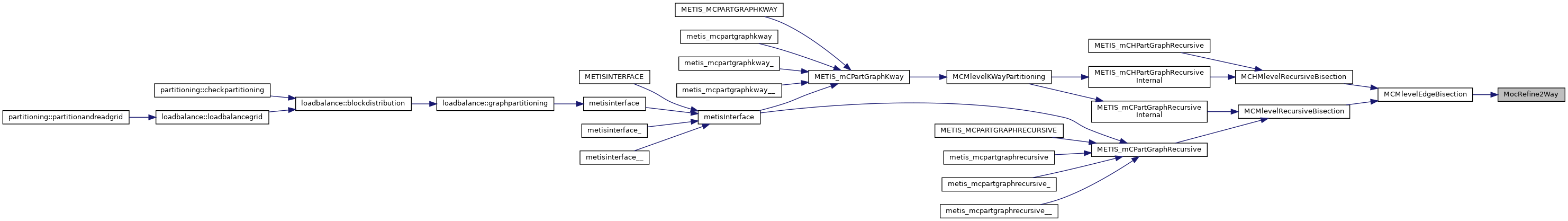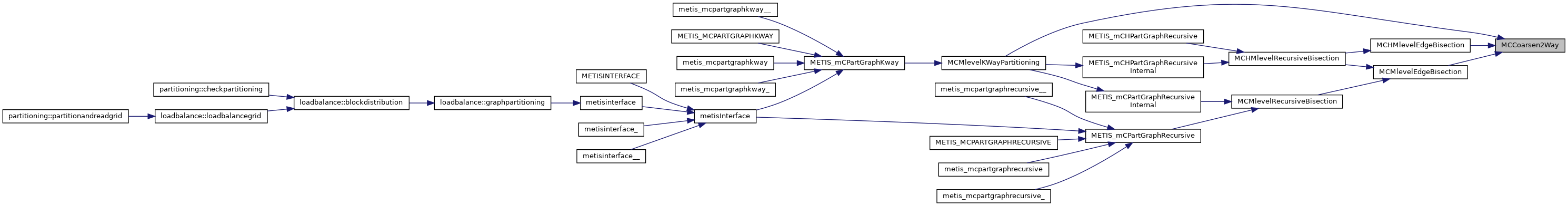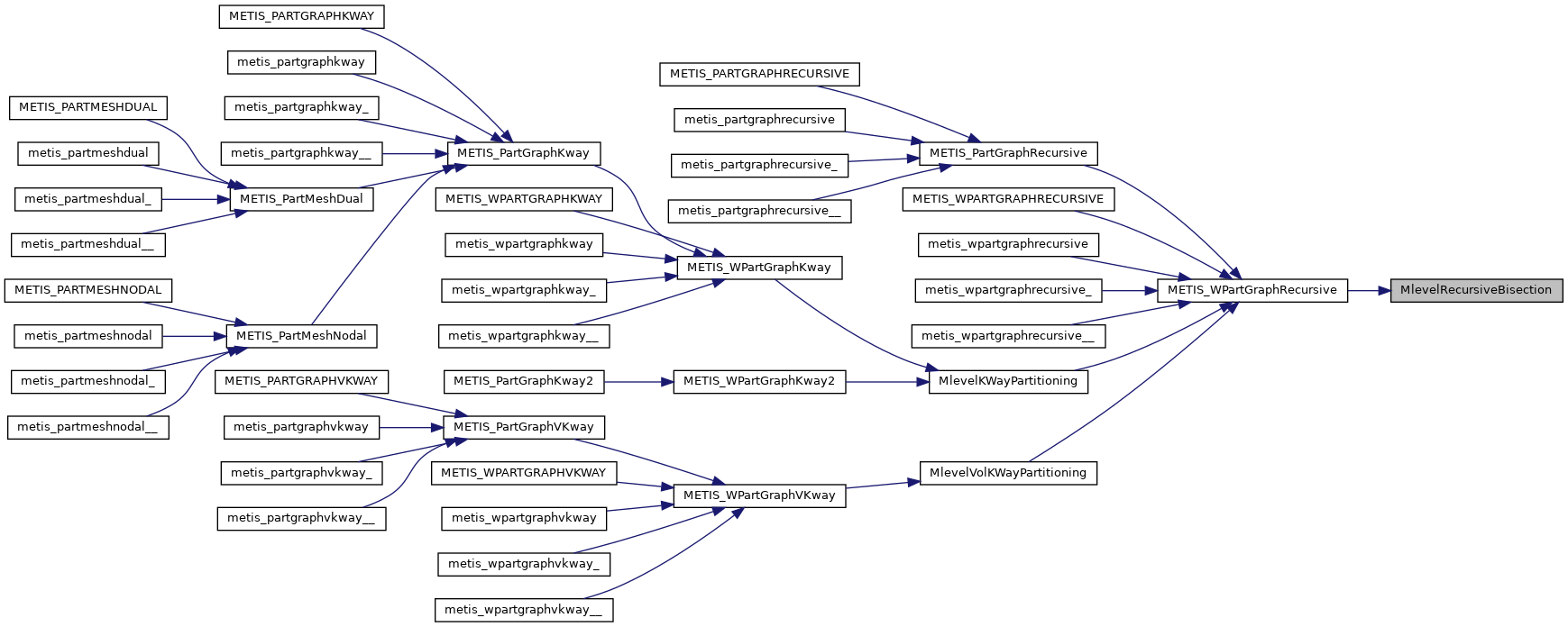 | void | metis_mcpartgraphrecursive (int *nvtxs, int *ncon, idxtype *xadj, idxtype *adjncy, idxtype *vwgt, idxtype *adjwgt, int *wgtflag, int *numflag, int *nparts, int *options, int *edgecut, idxtype *part) |